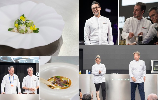 Another highlight of the morning came when Oriol Castro and Eduard Xatruch, chefs at the Disfrutar*** restaurant in Barcelona, burst into the auditorium. Together, they tried to summarise what they had been working on at their restaurant during 2025. They showed how they manage to pasify kiwi fruit, delighted the audience with a thistle flower, and captivated the staff by showing how they use the centrifugation technique to make a cream of nuts, which they then apply to a dish where peanuts take centre stage.